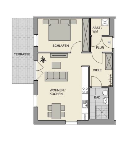 Die Wohnung im Erdgeschoß verfügt über 2 Zimmer mit Terrasse. In der Wohnung ist Vinyl verlegt. Das Bad mit Dusche ist gefliest. In der Wohnung befindet sich ein Abstellraum.